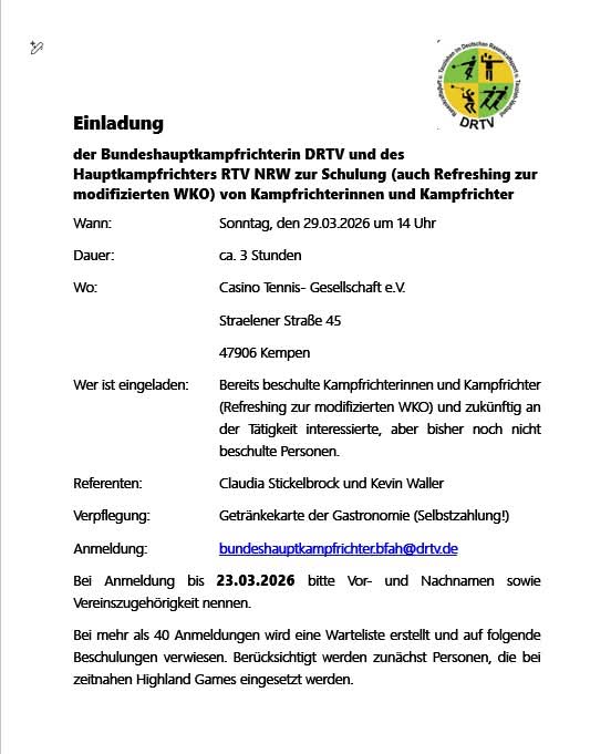 Lehrgang für Judges 23. Februar 202623. Februar 2026| Categories : Mitteilungen Der erste Lehrgang des Jahres findet am 29.03.26 in Kempen statt. Beitrags-Navigation Previous page Frohe Weihnachten Related Post Portrait RTV NRW 1. Juli 20251. Juli 2025 adminadmin In der Juli-Ausgabe des LSB-Magazins „Wir im Sport“ wird unser Verband als jüngstes Mitglied im [...] weiterlesenweiterlesen In eigener Sache 8. April 20258. April 2025 adminadmin Bevor die Saison startet ist es nicht mehr lange. Um gut gerüstet zu sein legt [...] weiterlesenweiterlesen Gelungene Jahreshauptversammlung 14. Januar 202514. Januar 2025 adminadmin Am 11. Januar2025 fand in Dormagen die Jahreshauptversammlung des RTV-NRW statt, an der 26 Stimmberechtige [...] weiterlesenweiterlesen